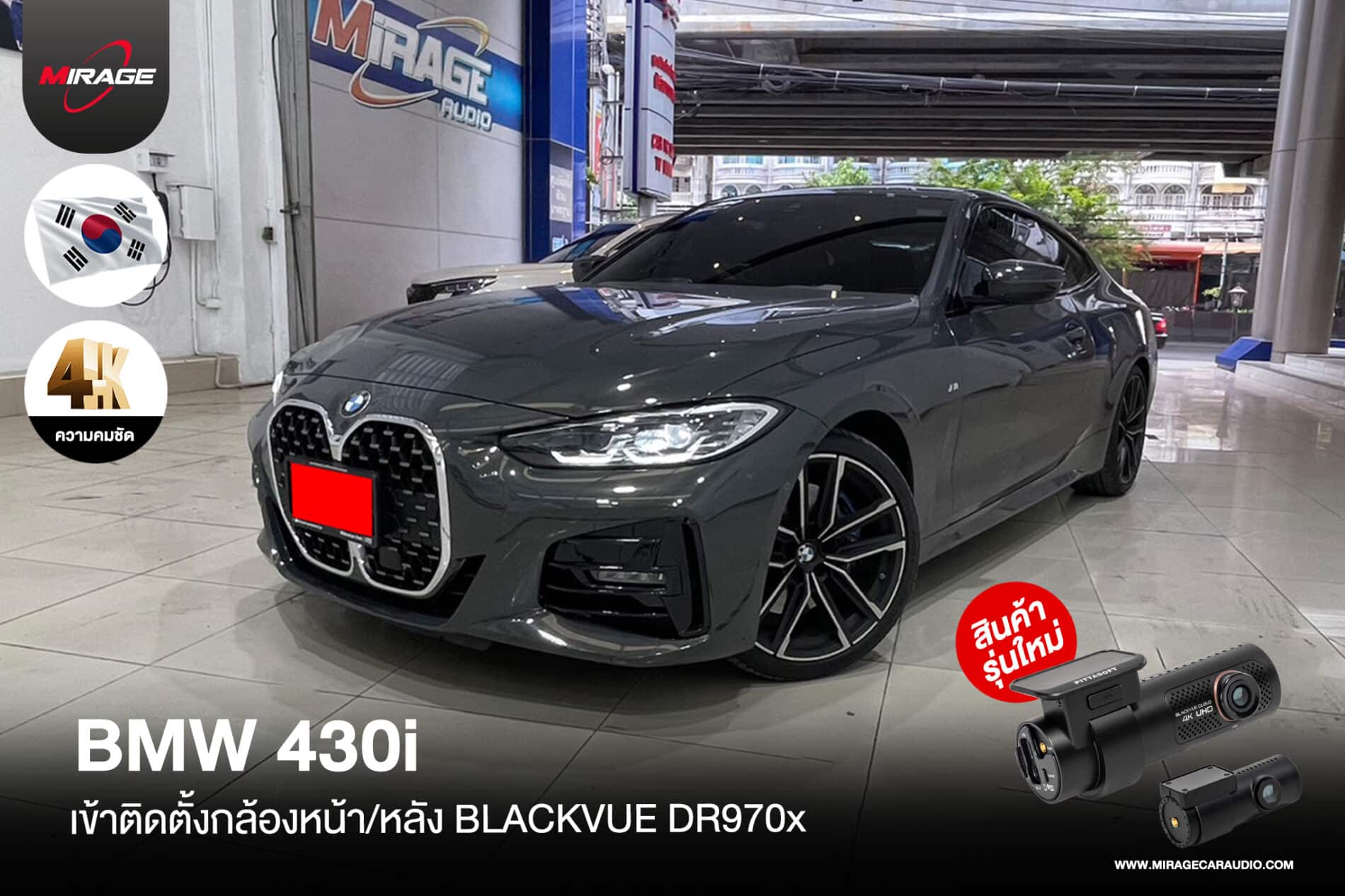 BMW 430i ติดตั้งกล้องบันทึกเหตุการณ์หน้า-หลัง Blackvue DR970x กล้องหน้าความละเอียดสูงถึง 4K กล้องหลัง Full HD ให้ความคมชัดที่ดีทั้งกลางวันและกลางคืน ดีไซน์เรียบหรูทันสมัย รองรับการใช้งานผ่านแอพพลิเคชั่นบนมือถือและยังมีระบบการบันทึกขณะจอดแบบตรวจจับการเคลื่อนไหวทั้งกล้องหน้าและกล้องหลัง